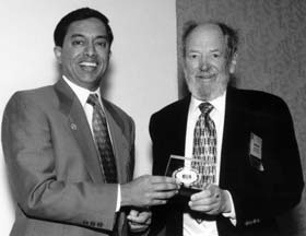 | Dr. Zweig receiving the NHA Education and Outreach Award from Venki Raman in 1998. |