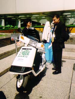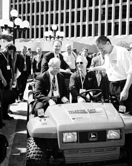Seated clockwise: David Garman, DOE, Dennis Weaver, Institute of Ecolonomics and Bill Summers, SRTC, enjoy a ride around the Place Ville-Marie in the fuel cell GATORTM vehicle, a joint project between Teledyne Energy Systems, DOE, Deere and Co., Southeastern Technology Center, University of South Carolina and York Technical College. |